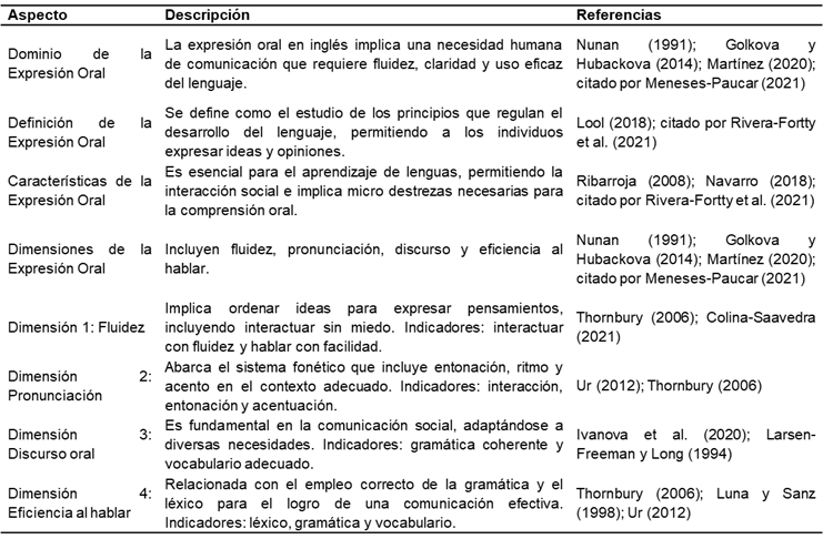 La Tabla 2 ilustra la expresión oral como una destreza básica para la comunicación, destacando como una necesidad que requiere fluidez, claridad y un uso eficaz del lenguaje (Nunan, 1991; Golkova y Hubackova, 2014; Martínez, 2020; citados por Meneses-Paucar, (2021). Su correcta ejecución permite transmitir información, así como expresar ideas y opiniones de manera efectiva. Se delimita como el estudio de los elementos que sistematizan el desarrollo del lenguaje, lo que implica que dominar esta habilidad es básico para el aprendizaje de lenguas y la interacción social (Lool, 2018; citado por Rivera-Fortty et al., 2021).