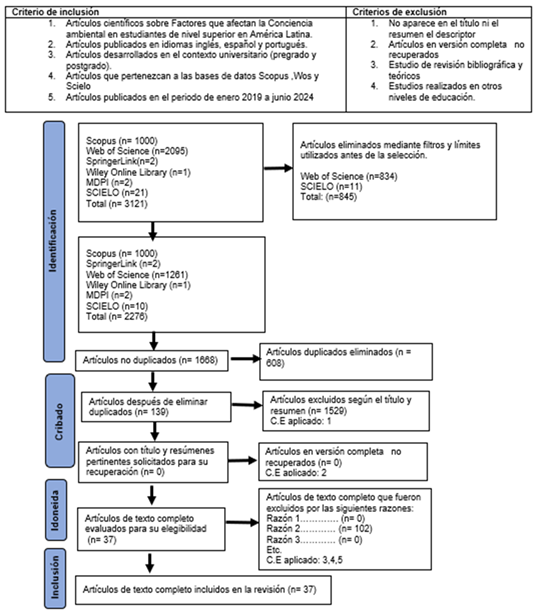 Se incluyeron artículos científicos sobre el comportamiento ambiental publicados en el contexto universitario en el periodo 2019 a junio de 2024, artículos publicado en idioma inglés, español y portugués en bases de datos Scopus, Wos, Scielo, MDPI, SpringerLink, Wiley Online Library. Se excluyeron documentos como revisiones, conferencias, capítulos de libros o cartas al editor, estudios documentales, revisiones sistemáticas, libros, conferencias y documentos no disponibles.