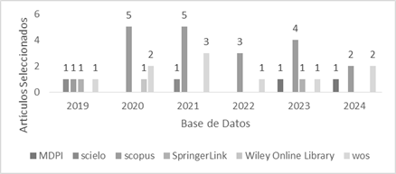 En el 2023, se registró el mayor número de publicaciones con siete artículos en MDPI, Scopus, SpringerLink, y Wos. Este aumento refleja un interés continuo y creciente en la investigación académica y la relevancia de múltiples plataformas para su diseminación. Finalmente, en 2024, se identificaron cinco artículos publicados en MDPI, Scopus y Wos, consolidando la tendencia de uso de estas bases de datos.