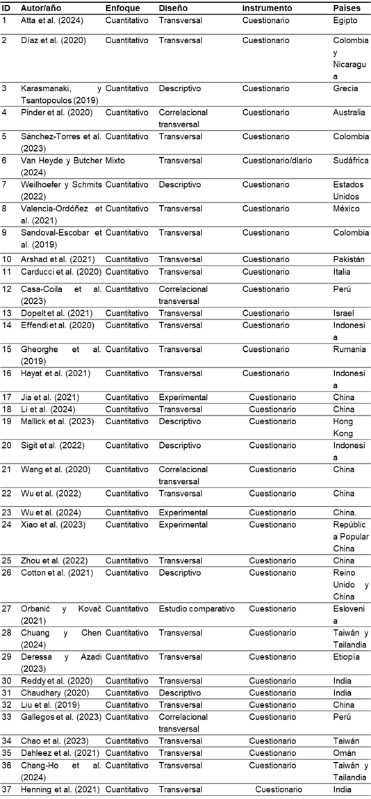 En la Tabla 1, se muestran claramente de los 37 estudios analizados un predominio del enfoque cuantitativo, representando el 97% del total con 36 investigaciones, mientras que solo 3% 1 estudio empleo una metodología mixta. El diseño más utilizado fue el transversal, con 23 estudios, seguido por el descriptivo con 6 estudios, correlacional transversal con 4, experimental con 3 investigaciones y estudio comparativo 1. Es notable que 36 de los estudios utilizaron el cuestionario como único instrumento de recolección de datos y 1 estudio el instrumento junto con el diario en la recolección de datos. En cuanto a la distribución geográfica, Asia domina la producción científica con 22 estudios, siendo China el país más representado con 9 investigaciones, seguido por Taiwán/Tailandia, India e Indonesia con 3 estudios cada uno, y otros países asiáticos que suman 4 estudios adicionales. En América Latina se encontró 7 estudios, destacando Colombia con 3 investigaciones, Perú con 2, y México y Nicaragua con 1 cada uno. Europa contribuye con 5 estudios, África con 3 y Oceanía con 1.