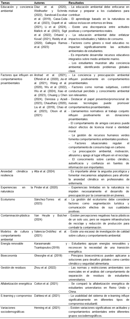La revisión de la literatura revela un notable aumento en la investigación sobre el comportamiento ambiental en estudiantes universitarios del 2019 al 2024. Los estudios destacan la importancia de las políticas universitarias de sostenibilidad, la sumatoria de silabo que permita dicha sostenibilidad educativa la influencia de las percepciones generadas por las prácticas y políticas institucionales. Estos hallazgos subrayan la necesidad de un enfoque integral que combine políticas institucionales efectivas y enfoques pedagógicos bien estructurados para fomentar un comportamiento ambiental positivo entre los estudiantes de educación superior.