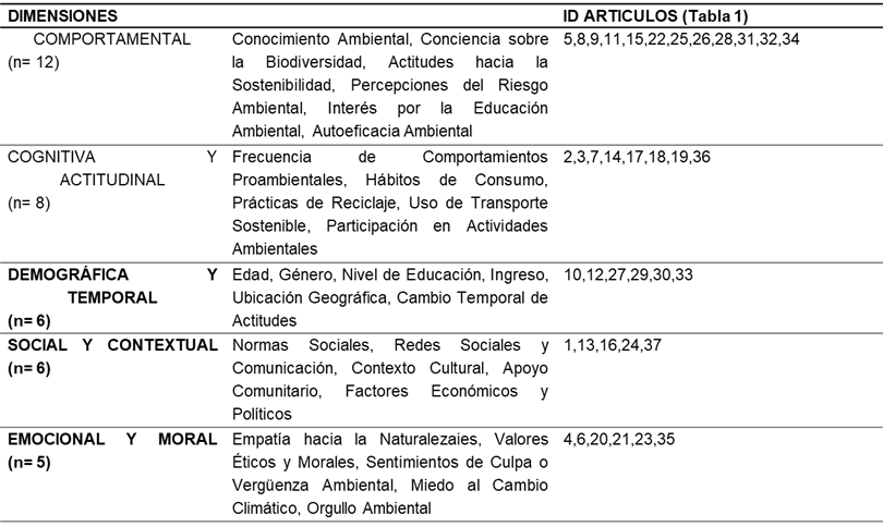 También se considera la presencia de la dimensión “demográfica y temporal”, los artículos que hacen referencia (n=6) 10,12,27,29,30 y 33. Mencionan que la variable principal es la edad, también se encuentran otras variables como: Edad, Género, Nivel de Educación, Ingreso, Ubicación Geográfica, Cambio Temporal de Actitudes Normas Sociales, Redes Sociales y Comunicación, Contexto Cultural, Apoyo Comunitario, Factores Económicos y Políticos. La dimensión social y contextual, los ID mencionados por los autores son (n=6): 1,13,16,24 y 37. Por otro lado, también se toma en cuenta el factor “emocional y moral”, (n=5) 4,6,20,21,23 y 35 se presentan algunas variables como Empatía hacia la Naturaleza es, Valores Éticos y Morales, Sentimientos de Culpa o Vergüenza Ambiental, Miedo al Cambio Climático, Orgullo Ambiental.