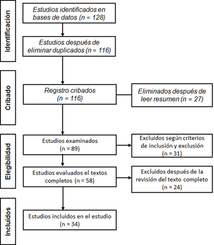En el registro de los documentos durante la revisión sistemática, se utilizó el método PRISMA. La figura 1 muestra un diagrama que ilustra el flujo de información durante este proceso de selección, desde la identificación inicial de 128 estudios hasta que la inclusión de 34.