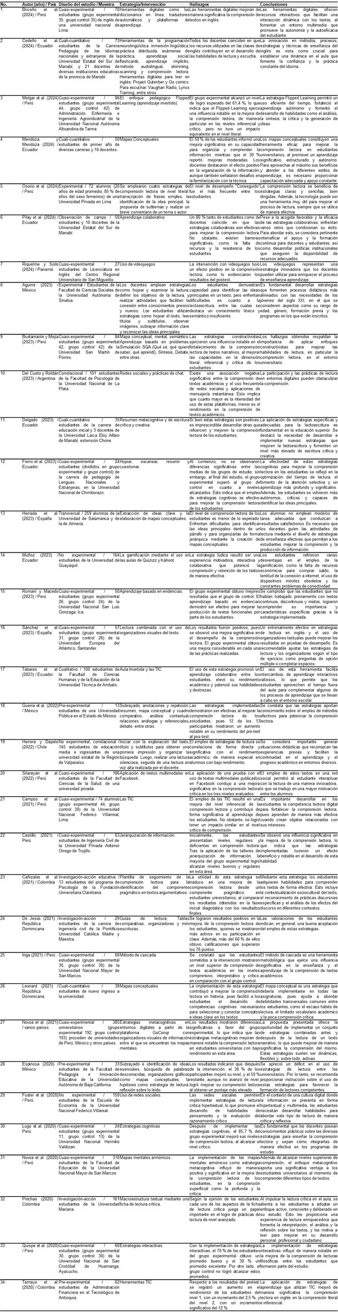 En la Tabla 1 se han resumido las 34 investigaciones que proponen estrategias para mejorar la comprensión lectora en estudiantes universitarios. Con el fin de facilitar la evaluación de la efectividad de estas propuestas, se registró información detallada de cada estudio como los autores, el año de publicación, el país, el diseño del estudio, los detalles de la muestra (número de participantes y universidad), la estrategia de comprensión lectora implementada (intervención), así como los principales hallazgos y conclusiones.