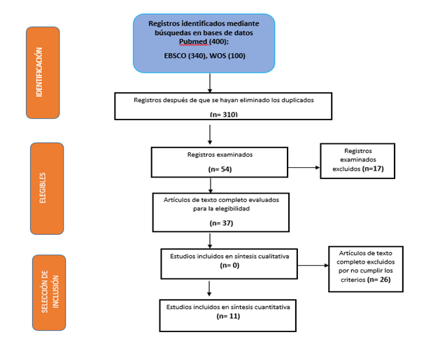 Seguidamente, la Figura 1 muestra un diagrama de flujo que ilustra el proceso de búsqueda y selección de estudios en una revisión sistemática de literatura. A continuación, se detallan los resultados obtenidos en cada etapa del proceso. Se identificaron un total de 840 registros mediante búsquedas en las bases de datos PubMed (400), EBSCO (340) y WOS (100). Tras la eliminación de duplicados, quedaron 310 registros únicos, con una legibilidad de 310 registros, se examinaron 54 estudios, 17 artículos fueron excluidos por no cumplir los criterios de inclusión, 37 artículos restantes fueron evaluados en texto completo para determinar su elegibilidad, quedando 11 estudios. Este diagrama refleja el riguroso proceso de filtrado y selección para garantizar que solo los estudios más relevantes y que cumplan con los criterios de inclusión sean considerados en el análisis final.