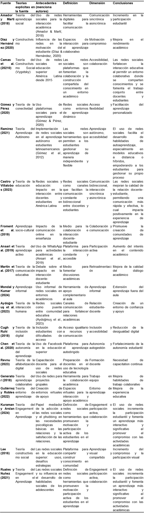 Estas dimensiones abarcan la variable analizada en la investigación como producto de la revisión de los artículos consultados. Una revisión exhaustiva de estudios publicados entre 2010 y 2023 sobre el uso de redes sociales en la educación superior en América Latina mostró que estas plataformas se han vuelto fundamentales para mejorar la interacción entre estudiantes y docentes. La mayoría de las investigaciones las considera un recurso esencial para facilitar la comunicación en el ámbito académico, ofreciendo un espacio dinámico y accesible para el intercambio de conocimientos y el fortalecimiento de relaciones educativas, especialmente en contextos con barreras físicas o temporales.