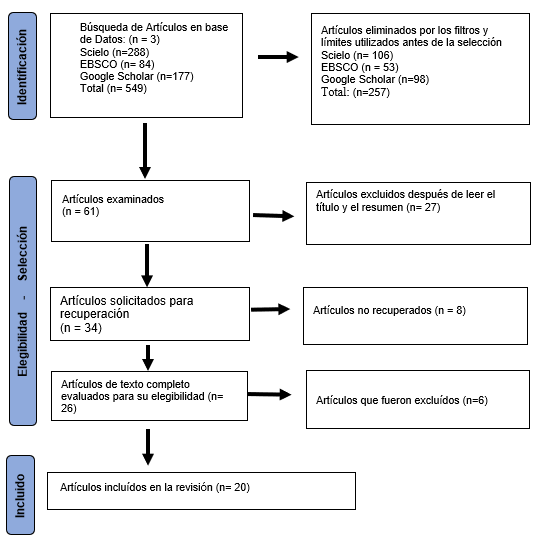 A continuación, en la Figura 1, se presenta el diagrama de flujo PRISMA, muestra la selección de los 549 artículos iniciales encontrados de acuerdo con los términos de búsqueda en las diferentes bases de datos: Scielo, EBSCO y Google Scholar, se eliminaron n=257 artículos a través de filtros y límites, como libros, capítulos de libros, congresos u otros artículos que no corresponden a nuestro estudio, los de acceso restringido y duplicados, así como investigaciones donde no aparecen las palabras clave, quedando n=61 artículos para ser examinados.