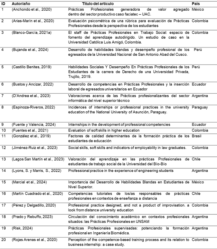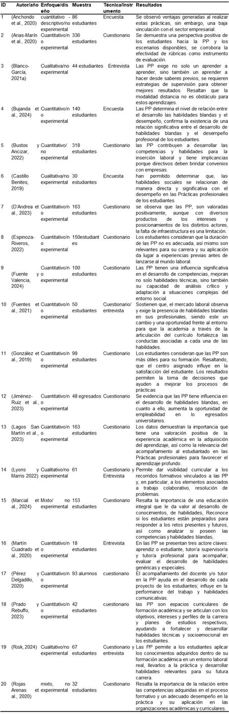 En la Tabla 3, se detallan las características metodológicas y los resultados relevantes encontrados en estos últimos 6 años (2019-2024) autor/año, enfoque/diseño, muestra, técnicas/instrumento y resultados. La mayoría de los autores han desarrollado el enfoque cuantitativo, diseño no experimental (n=14), cualitativo (n=5), enfoque mixto (n=1). En cuanto al tamaño de la muestra, se observa una variabilidad significativa, pudiéndose encontrar una muestra pequeña con 18 estudiantes, así mismo, muestra grande 336 estudiantes, probablemente se deba a los criterios de selección: aleatoria o por conveniencia, tipo de investigación que hayan elegido los autores y de la participación voluntaria de los estudiantes. Con respecto a la técnica/instrumento, la mayoría de los autores han utilizado el cuestionario (n=14), algunos, además usaron ambos: cuestionario y entrevista (n=3), también, se aplicaron la encuesta (n=3). En cuanto a los resultados, fueron considerados los puntos más destacados, sobre la importancia y desarrollo de habilidades mediante la ejecución de las Prácticas Profesionales en los estudiantes, encontrados en los 20 artículos seleccionados para su revisión.