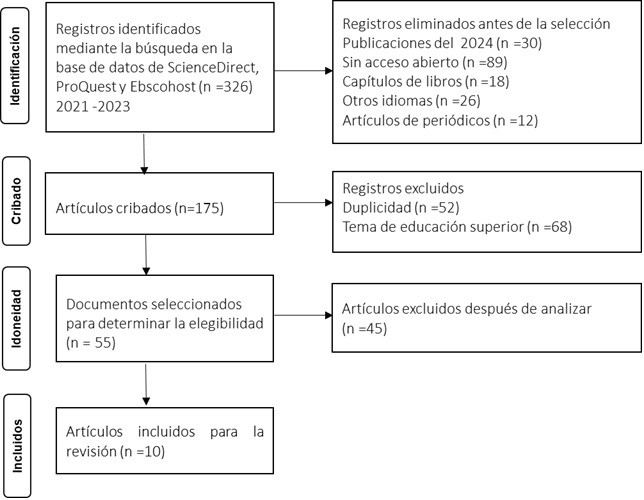La guía PRISMA permitió presentar de manera estructurada y transparente, la evaluación clara de los hallazgos, la calidad de los estudios incluidos y la certeza de las evidencias obtenidas a partir de las revisiones sistemáticas. En la etapa de identificación se eliminaron 175 que no cumplían con los criterios básicos; en la fase de cribado se eliminaron 120, de ellos 52 por duplicado y 68 por estar relacionados con el nivel de educación superior, resultando en 55 estudios pertinentes; en la fase de idoneidad se revisaron títulos y resúmenes, excluyendo 45, luego de una revisión más detallada. Finalmente se incluyen 10 estudios que cumplieron con todos los criterios establecidos Figura 1.