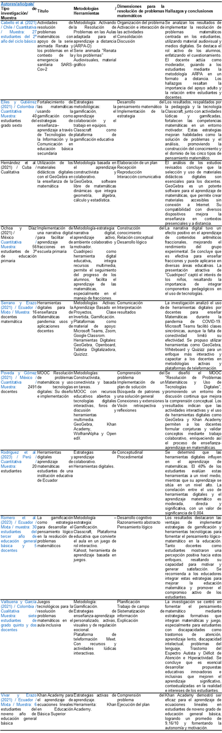 La revisión sistemática de la literatura científica, realizada entre los años 2021 y 2023, relacionada con las herramientas para la resolución de problemas matemáticos en educación básica, permitió identificar y analizar las investigaciones más relevantes y recientes en este ámbito.