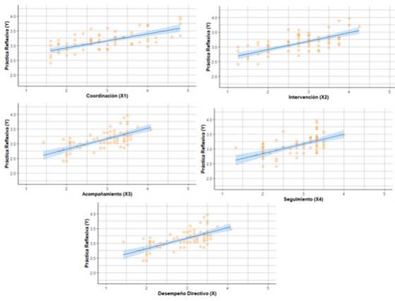 Para verificar el efecto del desempeño directivo y sus dimensiones en la práctica reflexiva de los docentes, se desarrollaron modelos de regresión lineal, para posteriormente determinar su significancia a través de una prueba de hipótesis; los parámetros del modelo y los resultados de las pruebas se reportan en la Figura 1. Se observa que, en todos los casos, tanto la pendiente como el coeficiente de correlación son positivos, lo que permite suponer que la relación entre los factores analizados es positiva, es decir, a medida que la variable independiente incrementa o disminuye de valor, la variable dependiente responde moviéndose en la misma dirección. Verificando los resultados de la prueba de correlación, se observa que, para los 5 modelos desarrollados, p<0.001, lo cual permite afirmar que: