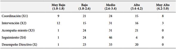 Para iniciar se buscó de determinar algún patrón de comportamiento, se desarrolló un recuento de casos según categoría a la variable desempeño directivo, el cual se reporta en la Tabla 1. Se observa que, para todos los casos, la categoría modal corresponde a Medio, con valores que van desde 24 (Coordinación - X1) casos hasta 46 casos (Seguimiento - X4). Para las dimensiones Coordinación (X1) e Intervención (X2), la categoría con menos casos reportados es Muy Alto, con 8 y 3 casos, respectivamente; mientras que para Acompañamiento (X3), Seguimiento (X4) y Desempeño Directivo (X), la categoría menos frecuente es Muy Bajo, con 1 caso cada uno.