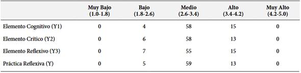 Por otro lado, el recuento de casos para la variable Práctica Reflexiva y sus dimensiones se muestra en la Tabla 2. Para todos los casos, la categoría Medio reporta la mayor cantidad de casos, con frecuencias que oscilan entre 55 (Elemento Reflexivo - Y3) y 59 (Práctica Reflexiva - Y); mientras que la categoría Bajo reporta la menor cantidad de casos, con frecuencias que van desde 4 (Elemento Cognitivo - Y1) hasta 7 (Elemento Reflexivo - Y3).
