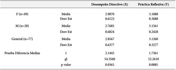 Para verificar si existen diferencias entre hombres y mujeres con respecto a los factores analizados, se desarrolla un análisis de varianza, cuyos resultados se muestran en la Tabla 3. Pude observarse que, para el caso de la variable Desempeño Directivo, sí existe una diferencia significativa (p<0.05) entre hombres y mujeres, mientras que para la variable Práctica Reflexiva, la prueba no fue capaz de detectar una diferencia significativa entre hombres y mujeres.