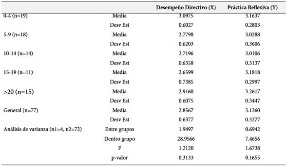 Para determinar si el tiempo de experiencia es capaz de condicionar los valores de las variables de estudio, se desarrolla un análisis de varianza, cuyos resultados se reportan en la Tabla 4. Para el desempeño directivo, se observa que la mayor de las medias corresponde al grupo con una experiencia menor a 5 años, con un valor de 3.0975, mientras que el menor valor pertenece al grupo con experiencia entre 15 y 19 años, con un valor de 2.6599; mientras que para el caso de la variable Práctica Reflexiva, el mayor promedio es el del grupo con más de 20 años de experiencia, con un valor de 3.2617, mientras que el grupo con el menor puntaje medio es el de 10 a 14 años de experiencia, con un valor de 3.0106. Para ambas variables, el análisis de varianza demuestra que no existe una diferencia significativa (p>0.05) entre los distintos grupos, sin embargo, se observa un ligero decaimiento del puntaje a medida que pasa el tiempo.