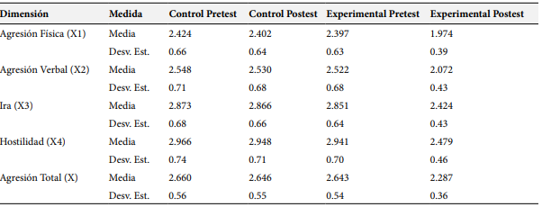 En contraste, en el grupo experimental, se identificaron diferencias altamente significativas (p < 0.05) en todas las dimensiones: agresión física (X1), agresión verbal (X2), ira (X3), hostilidad (X4) y agresión total (X). Estas diferencias reflejan una reducción significativa en los niveles de agresión luego de la implementación del programa, lo cual permite concluir que:
