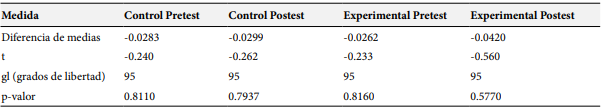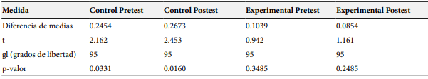 Con el propósito de verificar la eficacia del programa cognitivo conductual, se realizó una prueba t de diferencia de medias para muestras relacionadas entre los puntajes obtenidos en el pretest y el postest, tanto en el grupo control como en el grupo experimental. Los resultados se presentan en la Tabla 5, titulada Prueba t para muestras relacionadas: comparación pretest-postest por grupo.