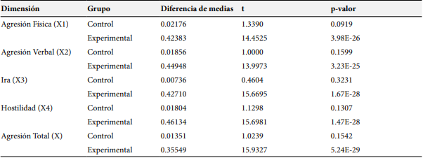 Los datos evidencian que, en el grupo control, no se observaron diferencias estadísticamente significativas en ninguna de las dimensiones evaluadas (p > 0.05), lo que indica que no hubo cambios significativos en los niveles de agresión entre los dos momentos de medición.