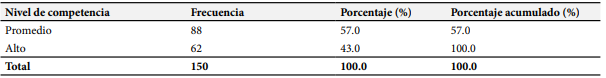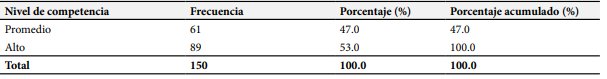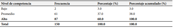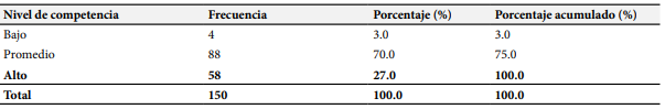 Tal como se muestra en la Tabla 1, la mayoría de los estudiantes (n = 88), que representa el 57% del total, alcanzó un nivel promedio de competencia digital. Por su parte, 62 estudiantes (43%) se ubicaron en el nivel alto. Es relevante destacar que ninguno de los participantes se situó en el nivel bajo, lo cual indica que todos los estudiantes evaluados poseen al menos un dominio básico satisfactorio de las competencias digitales.