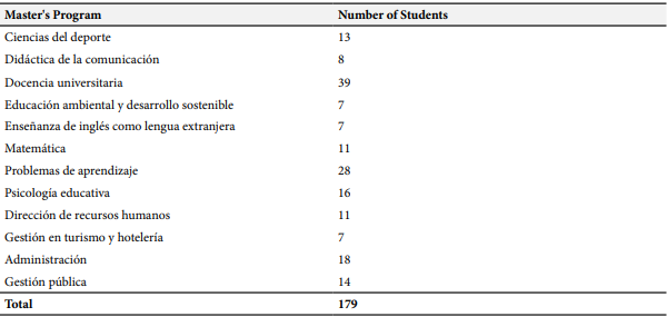 A hypothetical-deductive method guided the research, beginning with theoretical assumptions from which hypotheses were formulated and empirically tested. The population consisted of 168 second-semester students enrolled in various master’s degree programs at the postgraduate school of a public university in Lima, Peru. Based on the finite population formula, a sample of 122 students was selected for the study. The distribution of students by program is detailed in the following table 1.