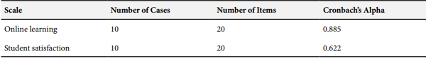 The reliability coefficients obtained-0.885 for the online learning scale and 0.622 for the student satisfaction scale-indicated that the instruments presented acceptable levels of internal consistency. Thus, the instruments were considered valid and reliable for application among second-semester postgraduate students in the context studied.