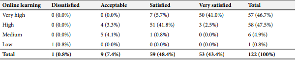 These results highlighted that higher levels of online learning were generally associated with greater student satisfaction, with the peak satisfaction corresponding to the “very high” level of online learning.