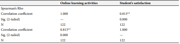 Furthermore, the Spearman’s Rho coefficient was 0.813, indicating a very high positive correlation. This result suggested that as the level and quality of online learning activities increased, the level of student satisfaction also tended to rise. The findings underscored the relevance of interactive and structured learning activities in promoting a positive student experience in online education environments.