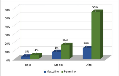 En la dimensión responsabilidad individual, se evidencia en la Tabla 2 que 13 estudiantes alcanzaron el nivel bajo con un 11%; 27 estudiantes se encuentran en el nivel medio con un 25%; y 70 estudiantes se encuentran en el nivel alto con un 64%. El porcentaje presente del género masculino fue de 24% del total; el mayor porcentaje presenta el género femenino con un 52% de diferencia. Esta diferencia es muy notoria en los niveles medio y alto.