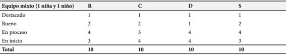 En primer lugar, se analizaron los equipos conformados por un niño y una niña. Los resultados, que se presentan en la Tabla 3, evidenciaron que la mayoría de estos equipos se encontraron en las categorías de “en proceso” e “en inicio” respecto a la manifestación de comportamientos asociados a la igualdad de derechos y responsabilidades. Solo un equipo alcanzó un nivel destacado de desarrollo en los cuatro indicadores observados, mientras que otros dos equipos obtuvieron un nivel bueno en algunos aspectos. Esto sugiere que, si bien hubo intentos de colaboración y respeto mutuo, aún existían limitaciones en la aplicación práctica de estos valores de forma equitativa y constante entre pares de distinto género.