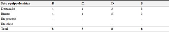 En relación con la medición de la dimensión igualdad de derechos y responsabilidades, se evaluó el trato igualitario que las niñas practicaron mediante el respeto (R), la cooperación (C), el diálogo (D) y la sensibilidad (S) durante la ejecución de tareas o en sus interacciones cotidianas en el aula. Esta dimensión fue mejor valorada en los equipos conformados únicamente por niñas. Como se muestra en la Tabla 4, todos los equipos femeninos se ubicaron en los niveles “destacado” y “bueno”, sin presencia de casos en los niveles “en proceso” ni “en inicio”.