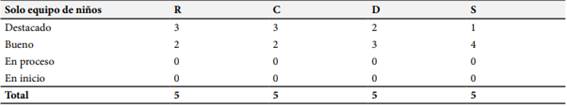 En el análisis de la dimensión igualdad de derechos y responsabilidades en equipos conformados exclusivamente por niños, se evaluó el trato igualitario basado en respeto (R), cooperación (C), diálogo (D) y sensibilidad (S). A diferencia de los equipos mixtos, estos equipos masculinos mostraron resultados más equilibrados entre los niveles superiores. Tal como se presenta en la Tabla 5, el 60% de los equipos alcanzó el nivel de “destacado” y el 40% se ubicó en “bueno”, sin registros en los niveles “en proceso” ni “en inicio”.