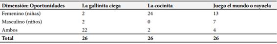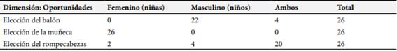 La dimensión oportunidades se centró en el acceso y la elección libre de juguetes, colores, juegos y preferencias profesionales, con el objetivo de explorar las nociones de igualdad de género en los preescolares de cinco años. En el caso específico de los juguetes, se evidenciaron patrones estereotipados marcados por el género asignado a ciertos objetos lúdicos.