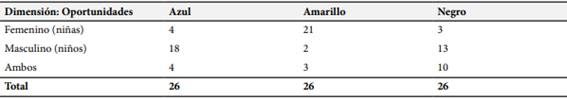 En cuanto a la dimensión oportunidades, específicamente en la elección de colores, se evidenciaron percepciones marcadamente influenciadas por estereotipos de género. En el caso del color azul, el 69.23% de los participantes lo atribuyeron exclusivamente al género masculino, mientras que tan solo un 15.38% lo consideró apropiado para ambos géneros. Por otro lado, el color amarillo fue asociado principalmente con las niñas por un 80.76% de los encuestados, lo cual refuerza estereotipos que vinculan colores claros o brillantes al género femenino. En cuanto al color negro, aunque un 50% lo atribuyó a los niños, un 38.46% señaló que era apto para ambos géneros, reflejando una percepción algo más flexible, pero aún con una fuerte inclinación hacia una asociación masculina.