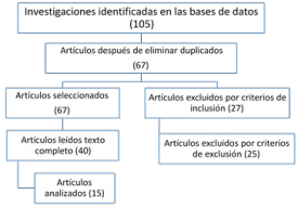 De los 105 artículos identificados, se escogieron 15 para este estudio, cuyas características se aprecian en la Tabla 1, como: autor(es), año de publicación, base de datos donde se extrajo, país, título de la publicación y conclusión o aporte. Se analizaron 4 artículos de la base de datos Scielo, 5 artículos de Dialnet, 2 artículos en Scopus, 3 estudios de Latindex y 1 de Redalyc.