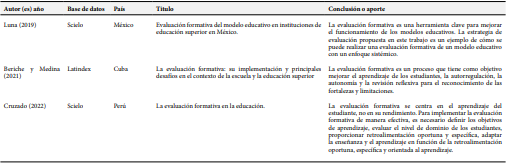Las investigaciones analizadas sobre la evaluación formativa concuerdan en caracterizarla como estrategia indispensable para el logro óptimo de la enseñanza general de los discentes, puesto que es un desarrollo metódico que ayuda en la obtención de información apreciable para el docente, abriendo camino a la reflexión de su propia destreza pedagógica. Además, permite a los jóvenes la posibilidad de tomar conciencia de las limitaciones y los avances de su formación académica.