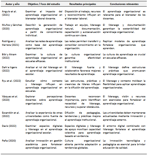 La Tabla 1 presenta la sistematización de los artículos seleccionados y analizados en esta investigación sobre aprendizaje organizacional en el contexto educativo. Estos estudios, publicados entre 2019 y 2023 en bases de datos de alto impacto como Scielo, Web of Science y Scopus, constituyen el sustento para los resultados y la discusión del estudio. La tabla organiza los artículos de acuerdo con los principales ejes temáticos identificados, permitiendo visualizar de forma clara los aportes clave y enfoques abordados en cada uno.