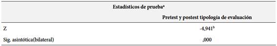 El análisis del contraste inferencial relacionado a la prueba de hipótesis de la variable tipología evaluativa, ha mostrado la existencia de una diferencia estadísticamente significativa en relación al pretest y postest. La prueba de los rangos con signo de Wilcoxon arrojó el valor Z = -4.941, con una significación asintótica bilateral de valor 0.000 menor al valor de Alfa 0.05. Ello, permitió demostrar que el grupo experimental adquirió cambios significativos antes del inicio de la intervención educativa comparado con el postest, evidenciada a partir de un incremento notable en los resultados de puntuación del postest. En consecuencia, las estrategias que se han aplicado tienen repercusiones positivas en el aprendizaje del alumnado en lo que respecta a la tipología evaluativa.