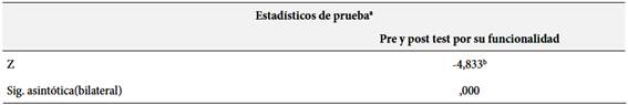 La Tabla 2 contiene el resultado de la inferencia estadística correspondiente a la dimensión evaluación por su funcionalidad. La prueba de rangos con signo de Wilcoxon es de Z=-4.833, lo que indica la existencia de la diferencia entre los resultados del pre y pos test. Además, la significación asintótica (bilateral) es .000, menor al valor del Alfa 0.05 (0.000 < 0.05). Al respecto, los resultados avalan la evidencia de que la intervención realizada ha producido una variación significativa en la dimensión funcionalidad. Esto implica que los alumnos del grupo experimental lograron demostrar una mejora relevante en sus resultados. Esto sugiere que las estrategias implementadas lograron un impacto positivo en la funcionalidad permitiendo vislumbrar un avance notable en los resultados de los pretest comparados a los resultados del postest.