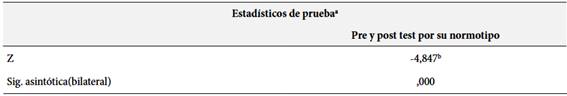 En lo que confiere a la prueba de hipótesis de la dimensión evaluativa por su normotipo, se sostiene que la intervención educativa ha podido provocar un cambio significativo, ratificado a través de los rangos con signo de Wilcoxon Z = -4847 con significación asintótica bilateral (p < 0,000) menor al valor de Alfa 0.05, lo que indica que las diferencias que aparecen entre el resultado del pre y post-test ponen de manifiesto que las estrategias puestas en acción han tenido un impacto positivo, siendo indicador de avance notable en el rendimiento académico de los estudiantes.