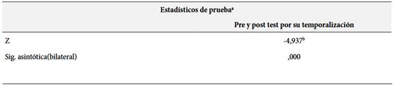 Por otra, parte la dimensión por su temporalización, la prueba de los rangos con signo de Wilcoxon muestra que el valor de Z = -4.937 y una significación asintótica bilateral de 0.000, menor al valor de Alfa 0.05. ha evidenciado que las diferencias empíricas de los resultados del pre y postest son estadísticamente significativos, con lo cual se ha probado la validez de las estrategias aplicadas positivamente en el rendimiento académico del alumnado.