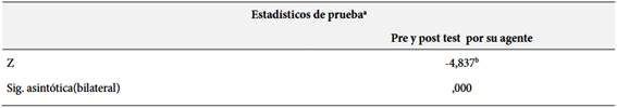 Finalmente, respecto a la dimensión de la evaluación por su agente, la prueba de los rangos con signo de Wilcoxon evidenció el valor de Z= -4.837, con una significación asintótica bilateral a 0.000, menor al valor de Alfa 0.05. En función a los resultados se explica que las diferencias que se producen entre el pre y post test son estadísticamente positivas. En consecuencia, se confirma que las estrategias puestas en práctica, ha mejorado el rendimiento de los estudiantes, lo cual ratifica definitivamente el efecto favorable de la intervención educativa en los aprendizajes de los estudiantes de nivel superior.