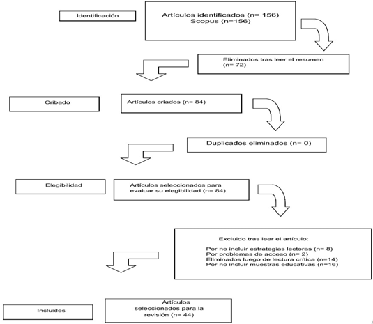 En una primera etapa, se preseleccionaron 156 artículos, los cuales fueron descargados desde la base de datos Scopus y gestionados posteriormente mediante el software de referencia Mendeley. A continuación, se procedió a la sistematización de los estudios, aplicando criterios de inclusión y exclusión conforme al diagrama PRISMA. Como resultado, se seleccionó un total de 44 artículos que cumplieron con los criterios establecidos y fueron incluidos en el análisis final. como se evidencia en la Figura 1.