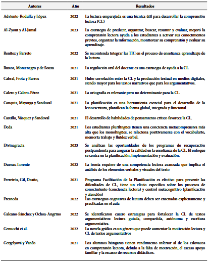 La formación docente resultó un componente esencial en la mejora de los procesos de enseñanza de la lectura, con énfasis en prácticas de alfabetización efectivas (Liswaniso y Pretorius, 2022). La conciencia de metacomprensión, entendida como la capacidad para predecir, monitorear y evaluar la comprensión durante la lectura, fue clave para desarrollar habilidades metacognitivas (Deda, 2021). Asimismo, el fortalecimiento del vocabulario receptivo incidió en el acceso al significado de las palabras (Pezoa y Orellana, 2021), mientras que la enseñanza de estructuras textuales variadas promovió un aprendizaje más integral (Calero y Calero-Pérez, 2021; Sepúlveda y Ortega, 2021).