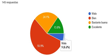 En la Figura 1, muestra que, del total de los estudiantes encuestados el 55,9% tienen una buena percepción general sobre la calidad recibida de la educación virtual, de tal manera el 24,1% menciona que fue bastante buena mientras que el 13.8% y por último el 6,2% nos indica que fue mala la calidad de la educación recibida en la facultad de ciencias empresariales durante el periodo 2020-2024. Estos datos revelan que la mayoría de los encuestados (aproximadamente el 80%) valoró positivamente la calidad de la educación virtual, percibiéndola entre buena y bastante buena. Esto sugiere un nivel de satisfacción considerable con las metodologías y recursos implementados en el contexto de la virtualidad.