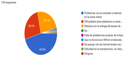 Adicionalmente, a las opciones predefinidas, las respuestas abiertas de los encuestados en la pregunta 2, resaltaron aspectos como la falta de plataforma propia de la Universidad; problemas de funcionalidad del wifi en laboratorios y la lentitud del sistema, carencia de herramientas tecnológicas personales necesarios para poder estudiar y la dificultad en la comprensión, debido a que se utiliza mucho vocabulario técnico y dificultad para adaptarse a nuevas plataformas.