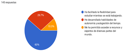 Los resultados que presenta en la Figura 3, muestran un 60% de los estudiantes encuestados afirmó que la educación virtual ha facilitado la flexibilidad para estudiar mientras se trabaja, lo que indica una alta valoración de la flexibilidad horaria. Asimismo, el 29,7% refirió que ha desarrollado habilidades de autonomía y autogestión del tiempo mientras que el 10,3% destacó accesos a recursos y expertos de diversas partes del mundo.