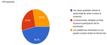 Asimismo, en cuanto a las estrategias pedagógicas, se determinó que la flexibilidad y el acceso a los contenidos fueron los aspectos más valorados por los estudiantes. Las clases grabadas se destacaron como una estrategia altamente efectiva, al permitir la revisión del material a ritmo individual. De igual manera, la utilidad de las plataformas interactivas en vivo y las herramientas en línea que fomentan la participación activa fue reconocida, lo que subraya la importancia de combinar recursos asincrónicos y sincrónicos para enriquecer el proceso de enseñanza-aprendizaje.