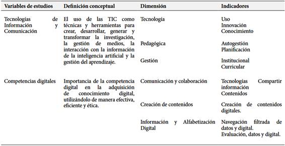 Por otra parte, la muestra se calculó para un error estimado del 5% y una confiabilidad del 99%, resultando ser de 55 docentes. Además, fue empleada para la recolección de información la técnica de la encuesta y como instrumento un cuestionario donde se relacionan las variables de interés. Al respecto, en la tabla 1, se muestra la operacionalización de las variables definidas en la investigación. Las dimensiones de las TIC se definieron como tecnología, pedagógica y de gestión, mientras las competencias digitales fueron la comunicación y colaboración, creación de contenidos e información y alfabetización digital.