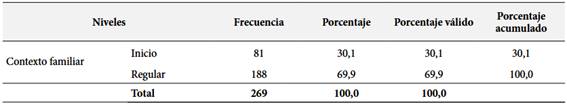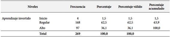 En referencia a la Tabla 3, los resultados se agrupan en dos niveles en referencia al contexto familiar: Inicio 81 estudiantes (30.1%) y Regular 188 estudiantes (69.9 %). Se observó que el 30,1 % de los estudiantes se encuentra en el nivel inicial, lo que señala que el factor familiar no es relevante para cumplir con las actividades del aprendizaje invertido. La existencia de un 69,9 % expresada como regular considera que el contexto familiar es un factor significativo en el desarrollo de las actividades de trabajo invertido. No hay estudiantes con un contexto familiar altamente favorable, lo que puede limitar el éxito del aprendizaje invertido, por tanto, sugiere que el sistema educativo podría implementar estrategias para involucrar más a las familias