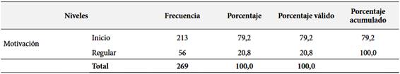 En referencia a la Tabla 2, los resultados en general se agrupan en dos niveles: Inicio 213 estudiantes (79.2%) y Regular 56 estudiantes (20.8 %) en referencia al factor exógeno motivación. Se observa que el 79,2 % de la población estudiantil se encuentra en un nivel inicial lo que sugiere que consideran que las actividades de aprendizaje invertido no les trae aumento en la motivación, solo una quinta parte de los estudiantes 20,8 % alcanza un nivel regular de motivación el cual indica un amplio margen que ha de realizar el docente para aumentar la motivación. La motivación es un factor crítico y preocupante, ya que un porcentaje muy alto de estudiantes (79.2%) presenta un bajo nivel de motivación. Dado que ningún estudiante alcanzó un nivel alto de motivación, es necesario reevaluar las estrategias pedagógicas utilizadas en el aprendizaje invertido.